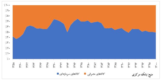 در اطلاعات این نمودار، مواد اولیه و کالاهای واسطهای و همینطور کالاهای طبقهبندینشده در نظر گرفته نشده است و صرفاً نسبت کالاهای مصرفی و سرمایهای مورد توجه بوده است. عقبنشینی واردات کالاهای سرمایهای در مقابل پیشروی واردات کالاهای مصرفی نشانهی خوبی برای جبران استهلاک یا ایجاد ظرفیتهای جدید در اقتصاد ایران نیست.
