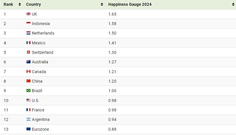 با کمال تعجب، انگلستان به عنوان شادترین کشور در کل رتبه‌بندی دیده می‌شود. این رتبه‌بندی با سطوح بالای شادی در میان نسل‌های مسن‌تر تقویت شده است، اگرچه با گزارش جهانی شادی که انگلستان را در رتبه ۲۰ام از میان ۱۴۳ کشور در سال ۲۰۲۴ قرار می‌دهد، در تضاد است. سایر شاخص‌های جهانی، از جمله شاخص‌های سازمان ملل، انگلستان را در موقعیت مشابهی نشان می‌دهند.