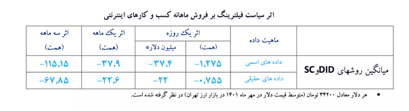 گزارشهای مختلف نشان میدهند اعمال محدودیتها و قطع اینترنت از شهریور ۱۴۰۱، خسارات سنگینی به کسبوکارهای مختلف وارد کرده است. فیلترینگ اینترنت به عنوان یک شوک ناگهانی به کسبوکارهای اینترنتی وارد شده است. برای ارزیابی دقیقتر تأثیر این شوک بر فروش این کسبوکارها، پژوهشگران از روشهای آماری مختلفی مانند «تفاوت در تفاوت» و «کنترل مصنوعی» استفاده کردهاند. جدول زیر، میانگین نتایج حاصل از دو روش تفاوت در تفاوت و کنترل مصنوعی را نشان میدهد: