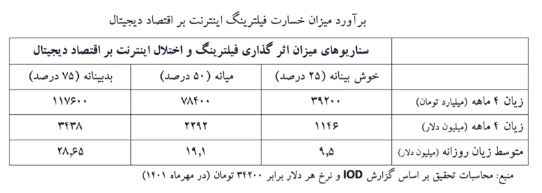 با استفاده از این دادهها و سناریوهای مختلف، گزارش پایگاه داده باز ایران تخمین زده است فیلترینگ اینترنت در سال ۱۴۰۱ در یک دوره چهار ماهه و در خوشبینانهترین حالت، حدود ۳۹ هزار میلیارد و ۲۰۰ میلیون تومان به اقتصاد دیجیتال کشور خسارت وارد کرده است.