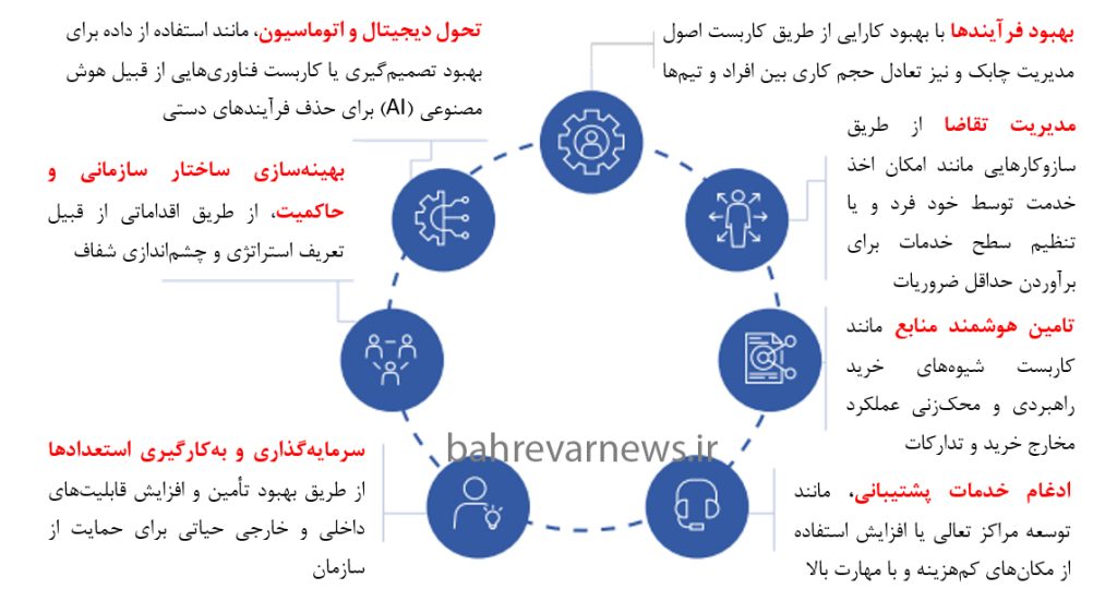 سازمان های دولتی تحت الزامات بهبود بهره وری مشابه با الزامات بخش خصوصی عمل نمی کنند. این موضوع، در کنار نوسانات بودجه، به این معنی است که بسیاری از سازمان ها فاقد توانایی لازم برای شناسایی و به دست آوردن مداوم فرصت های بهبود بهره وری هستند. بر اساس تجربه کمک به بیش از ۳۰۰ سازمان دولتی برای بهبود کارایی عملیاتی، هفت اهرم با تطبیق با چارچوب های بخش خصوصی شناسایی شده اند که سازمان های دولتی می توانند برای بهبود بهره وری آن ها را دنبال کنند (مطابق شکل).