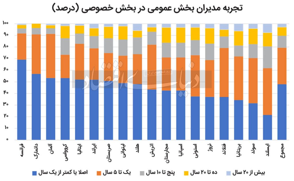 همانطور که مشاهده میشود، این موضوع در بین کشورها دامنه متنوعی دارد. بهعنوان مثال، این نسبت در فرانسه کمتر و در ایسلند بیشتر است. با این حال، در مجموع پیمایش، سهم مدیرانی که تجربه بیش از یکسال کار در بخش خصوصی را دارند به کمی بیش از نیمی از آنان میرسد.