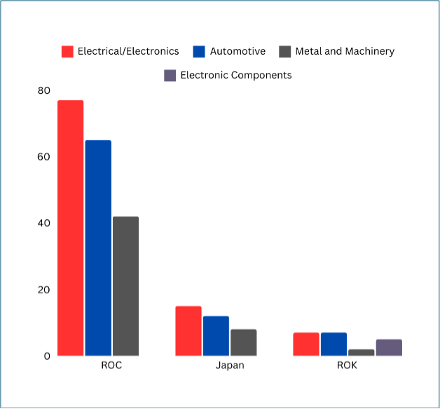 از نظر مصرف کننده صنعتی در نصب ربوتها، برق و الکترونیک (electrical/electronics) بیشترین تعداد نصب سالانه را در این سه کشور داشته است، که با احتساب تایوان به 77000 واحد در سال 2023 رسید که پس از آن خودروسازی و فلزات و ماشین آلات قرار دارد.(شکل 2).