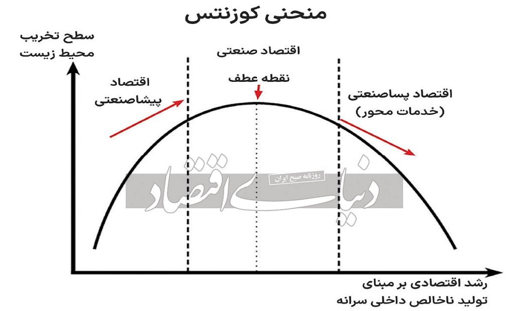 این منحنی، رابطه میان رشد اقتصادی و تخریب محیطزیست را به شکل یک منحنی معکوس نشان میدهد. براساس این نظریه، در مراحل اولیه رشد اقتصادی، تخریب محیطزیست به دلیل فعالیتهای صنعتی، استفاده بیش از حد از منابع طبیعی و افزایش آلودگیها افزایش مییابد، اما پس از رسیدن به سطحی از رشد اقتصادی و توسعه، این تخریب کاهش مییابد.