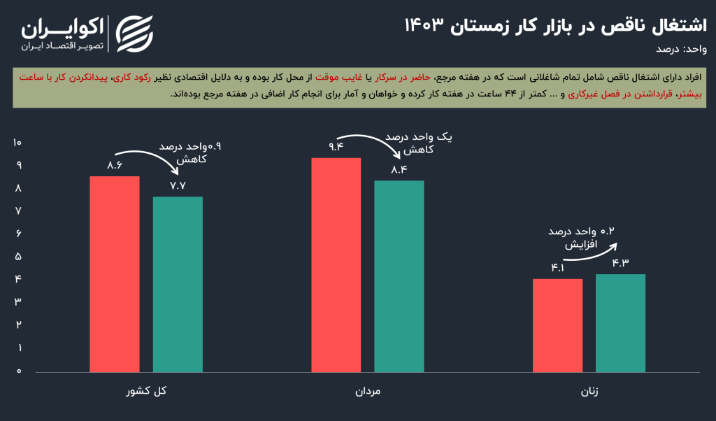 دادههای مرکز آمار نشان میدهد که نرخ اشتغال ناقص کل کشور از 8.6 درصد در زمستان 1402 به 7.7 درصد در زمستان 1403 کاهش یافته است. این کاهش عمدتا به دلیل کمشدن اشتغال ناقص بین مردان بوده است. این نرخ از 9.4 درصد به 8.4 درصد اُفت کرده است.