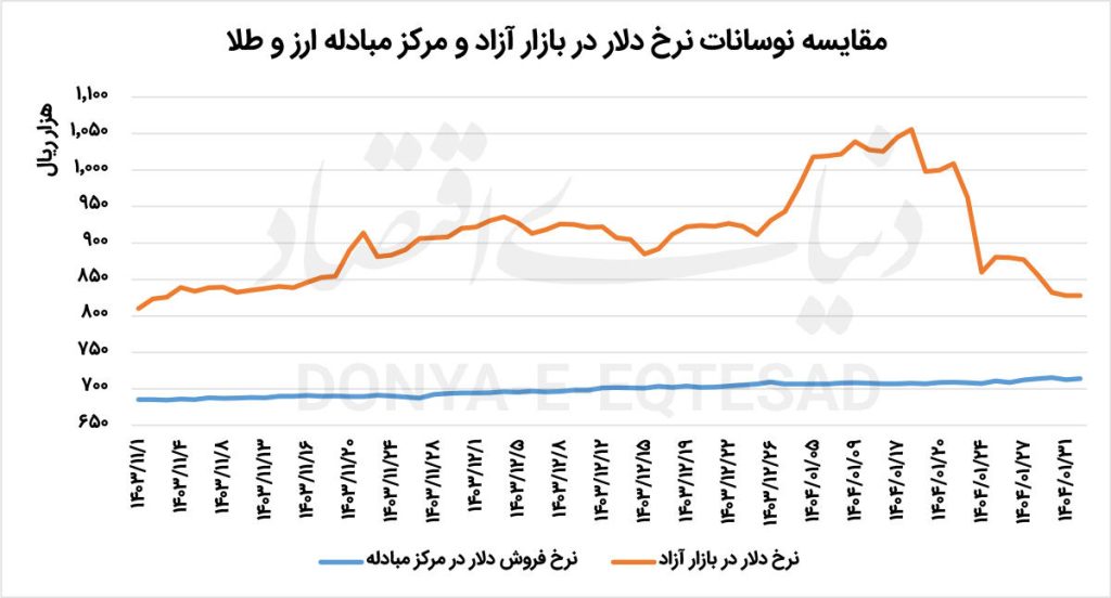به بیان دقیق‌تر شاهد تکرار سناریو سامانه نیما در مرکز مبادله ارز و طلا هستیم. درهمین‌‌‌‌‌‌حال باید خاطرنشان کرد؛ فاصله میان کم‌ترین و بیشترین نرخ دلار کشف‌شده در مرکز مبادله ارز و طلا طی ماه‌های گذشته بسیار محدود بوده‌است. این نوسان محدود به روشنی در نمودار قابل‌رویت است، درحالی‌که بهای دلار در بازار آزاد طی همین بازه زمانی نوسانات قابل‌توجهی را پشت‌سر گذاشته‌است. عدم‌تبعیت دو مسیر یادشده حکایت از ناکارآمدی عملکرد مرکز مبادله در خریدوفروش ارز تجاری دارد.