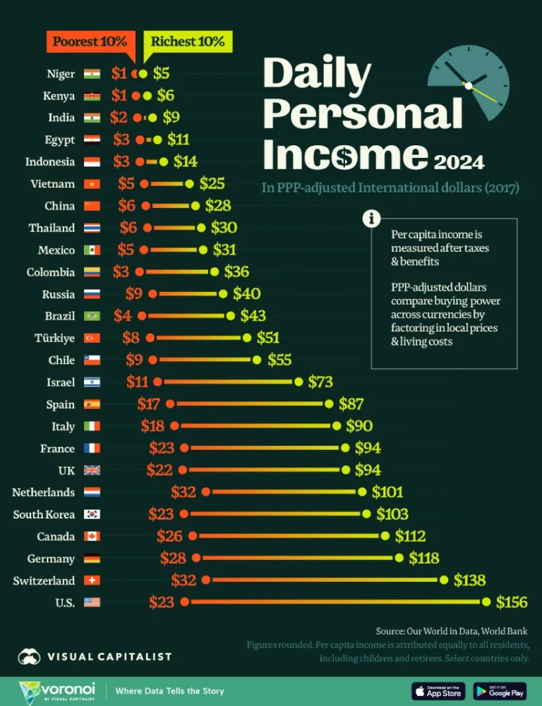 به گزارش پایگاه خبری بهره ورنیوز به نقل از روزیاتو، برای نگاهی دقیقتر به استانداردهای زندگی، اینفوگرافی زیر ارقام درآمد سال ۲۰۲۴ را به تصویر میکشد. تمام ارقام به دلار بینالمللی با قیمتهای سال ۲۰۱۷ تعدیلشده برای برابری قدرت خرید (PPP) هستند.