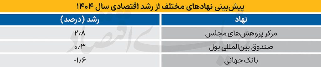 عدمقطعیت بالای شرایط موجود موجب شده مرکز پژوهشهای مجلس، صندوق بینالمللی پول و بانک جهانی سه روایت مختلف از چشمانداز رشد اقتصادی کشور در سال ۱۴۰۴ ارائه دهند. مرکز پژوهشها نرخ رشد ۱۴۰۴ را ۲.۸درصد، صندوق بینالمللی پول ۰.۳درصد و بانک جهانی منفی ۱.۶درصد پیش بینی کردهاند.