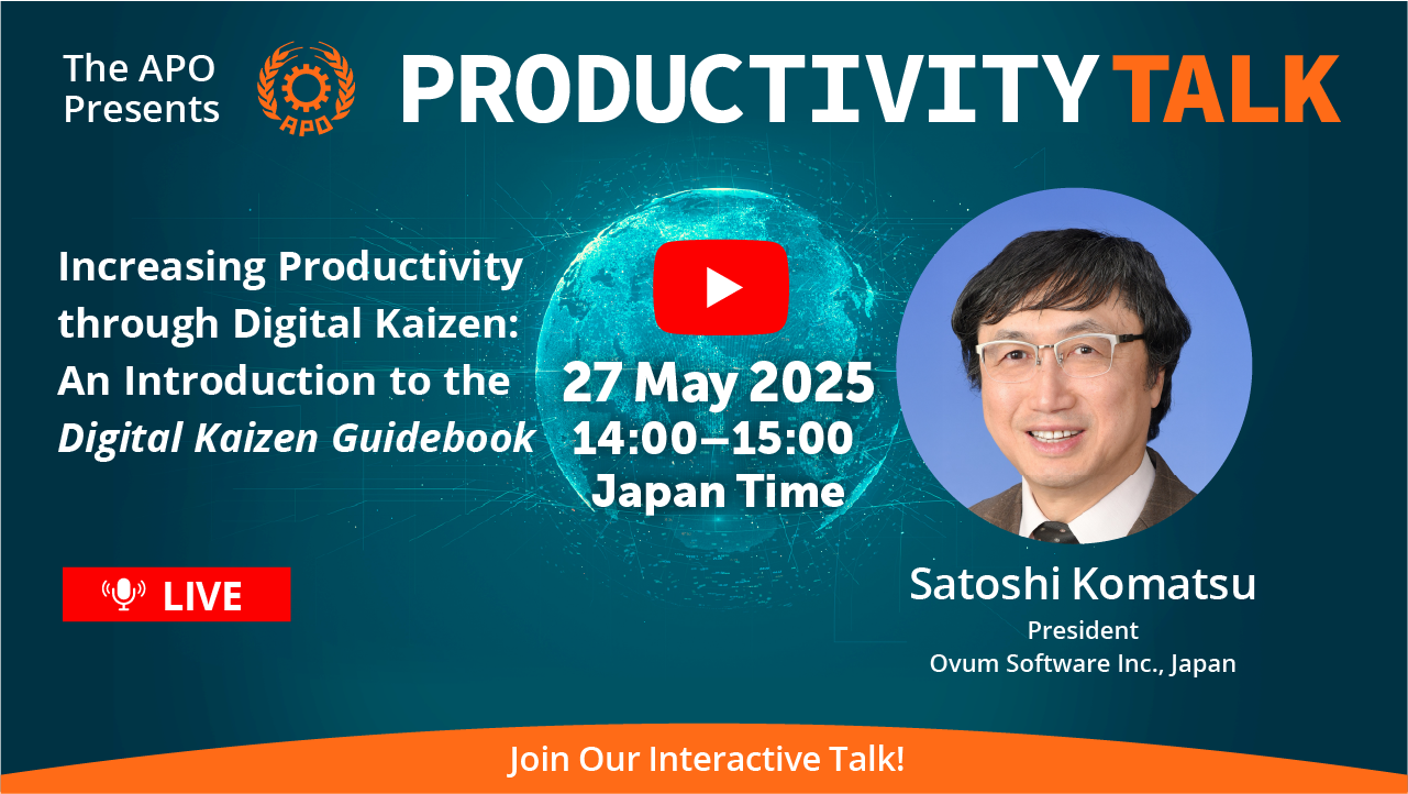 سازمان بهره وری آسیایی یک گفتگوی بهره وری با عنوان «افزایش بهرهوری از طریق کایزن دیجیتال: مقدمهای بر کتاب راهنمای کایزن دیجیتال (Increasing Productivity through Digital Kaizen: An Introduction to the Digital Kaizen Guidebook) برگزار میکند.