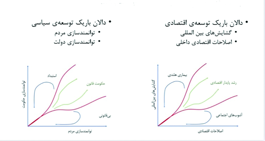 برای عبور از این دالان باریک، نیازمند سیستمی است که در آن، اصلاحات اقتصادی و نهادهای حکمرانی بر هم متوازن باشند و به صورت مستمر و پایدار رشد یابند. در این مسیر، عدم تعادل یا حرکت ناپایدار، ممکن است به عواقب منفی جبران‌ناپذیر منجر شود، بنابراین نیازمند برنامه‌ریزی دقیق، ارزیابی دوره‌ای و اصلاحات انعطاف‌پذیر است.