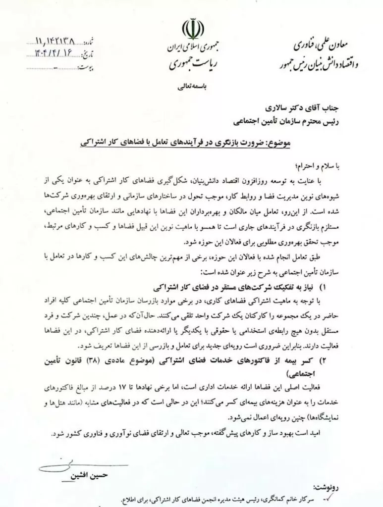 به گزارش پایگاه خبری بهره ورنیوز به نقل از دیجیاتو، «حسین افشین»، معاون علمی، فناوری و اقتصاد دانش‌بنیان رئیس‌جمهوری در نامه‌ای به «مصطفی سالاری»، رئیس سازمان تامین اجتماعی، نوشت: «تعامل میان مالکان و بهره‌برداران این فضاها با نهادهایی مانند سازمان تامین اجتماعی، مستلزم بازنگری در فرآیندهای جاری است تا همسو با ماهیت نوین این قبیل فضاها و کسب‌وکارهای مرتبط، موجب تحقق بهره‌وری مطلوبی برای فعالان این حوزه شود.»