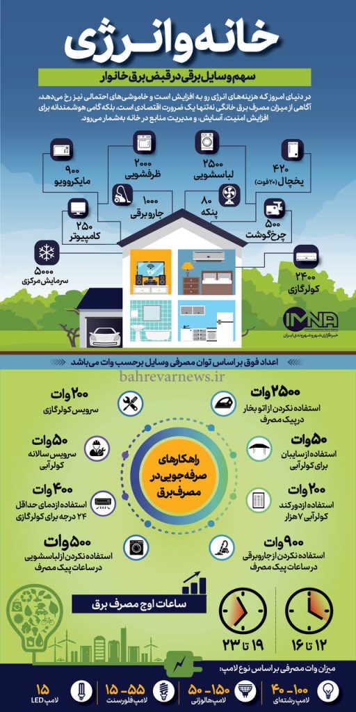 پرمصرفترین و کممصرفترین وسایل برقی خانگی کدامند؟ راههای صرفهجویی در مصرف برق چیست؟ ساعت پیک (اوج) مصرف چه ساعتی است؟ هر کدام از انواع لامپهای موجود در بازار چه میزان برق مصرف میکنند؟ در این اینفوگرافیک به این سوالات پاسخ میدهیم.