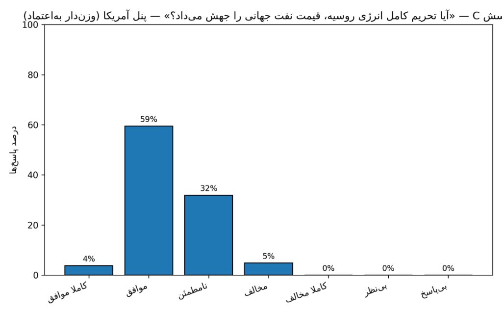 در میان اقتصاددانان آمریکایی، اکثریت پاسخ‌ها در سمت موافق یا بسیار موافق قرار داشت؛ بسیاری معتقد بودند وابستگی شدید بودجه روسیه به درآمدهای نفت و گاز باعث می‌شد چنین تحریمی ضربه‌ای جدی به توان مالی و تداوم ماشین جنگی این کشور وارد کند. تنها اقلیتی اندک نظر مخالف داشتند یا نسبت‌به نتیجه چنین اقداماتی تردید ابراز کردند.