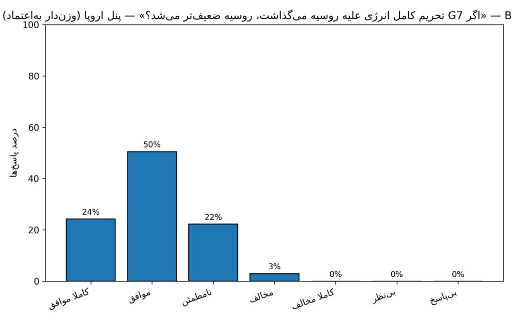 این دومین پرسشی است که در نظرسنجی دانشگاه شیکاگو از اقتصاددانان آمریکایی و اروپایی مطرح شد: اگر گروه هفت در سال۲۰۲۲ تحریم کامل انرژی علیه روسیه را اعمال می‌کرد، آیا روسیه امروز از نظر نظامی و اقتصادی به‌طور معناداری ضعیف‌تر بود؟