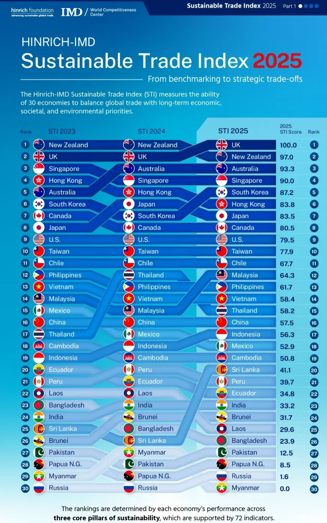 به گزارش پایگاه خبری بهرهورنیوز به نقل از روزیاتو، دادههای این اینفوگرافیک از Hinrich Foundation گرفته شده است که نسخه ۲۰۲۵ «شاخص تجارت پایدار» (Sustainable Trade Index – STI) را بررسی میکند. این شاخص هر سال با همکاری مرکز رقابتپذیری جهانی IMD برای ارزیابی ۳۰ اقتصاد منتخب جهان منتشر میشود.