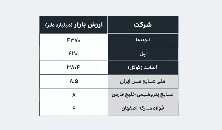 اما این رکوردشکنی در بورس تهران در حالی رخ می‌دهد که در بازارهای جهانی، فهرست پنج شرکت با بیشترین ارزش بازار به طور کامل در اختیار غول‌های فناوری است: اپل، مایکروسافت، آلفابت (گوگل)، آمازون و انویدیا. صرفاً برای مقایسه، ارزش بازار انویدیا به تنهایی حدود ۴.۳۷ تریلیون دلار است؛ یعنی بیش از ۴ هزار میلیارد دلار. کمتر از 5 ماه پیش، انویدیا به اولین شرکت 4 تریلیون دلاری دنیا تبدیل شد.