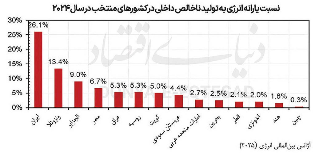 طبق آمار، نسبت یارانه انرژی به تولید ناخالص داخلی در ایران به 26.1درصد رسیده که بالاترین میزان در جهان است. در این گزارش همچنین میزان یارانه پنهان انرژی در سال1403، معادل 111میلیارد دلار برآورد شده است. تداوم قیمتهای غیرواقعی به رشد شتابان مصرف در بخشهای بنزین، برق و گاز منجر شده است.