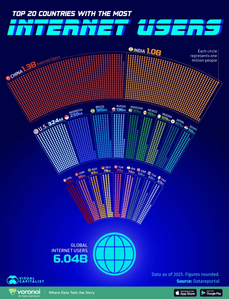 این اینفوگرافی، ۲۰ کشور نخست را بر اساس تعداد کل کاربران اینترنت رتبهبندی میکند و نشان میدهد چگونه جمعیت، اغلب نسبت به میزان ضریب نفوذ اینترنت اثر بیشتری دارد. دادههای این مطلب از Datareportal گرفته شده است.