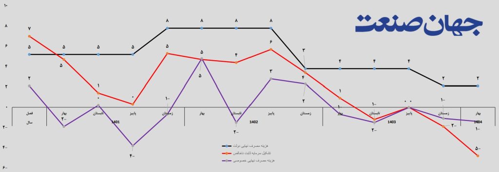 به همین دلیل این اعداد بیشتر نشانه «توقف سقوط» هستند تا آغاز یک جهش سرمایهای. نقطه شکست اما در سال۱۴۰۳ رقم میخورد. نرخ رشد سرمایهگذاری از ۴/۳درصد در بهار به ۹/۰درصد در تابستان کاهش مییابد و در پاییز رسما منفی میشود؛ منفی ۲/۱درصد. در زمستان نیز این نرخ به صفر میرسد.